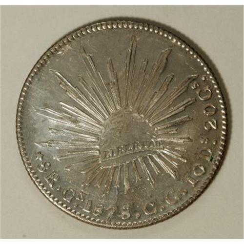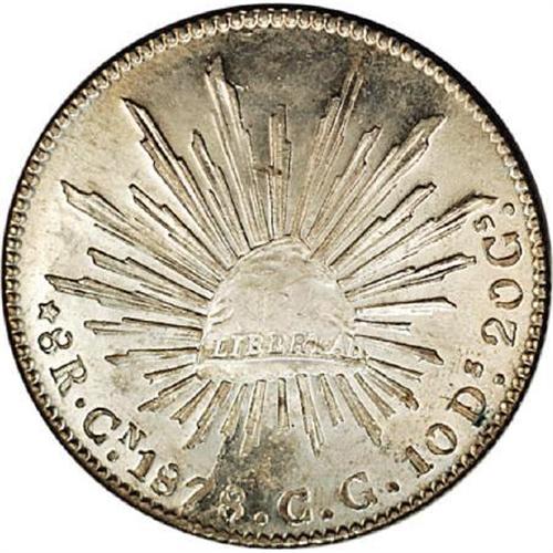 <B>Republic Cap and Rays 8 Reales 1878 Cn-CG,</B></I> KM377.3, Choice BU. Lustrous and well struck. <BR><BR><b>Shipping:</b> Coins & Currency (<a target="_blank" href="http://www.heritageauctions.com/common/shipping.php">view shipping information</a>)