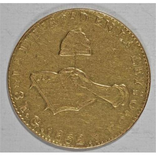 <B>Republic Hand on Book gold 8 Escudos 1862 Go-YE,</B></I> KM383.7, polished VF-XF, mount trace on the rim. Although the assayer would appear to be YF, closer inspection would seem to indicate it is actually a weakly defined YE. <B>Sold as is, no return lot.</B></I><BR><BR><b>Shipping:</b> Coins & Currency (<a target="_blank" href="http://www.heritageauctions.com/common/shipping.php">view shipping information</a>)