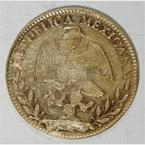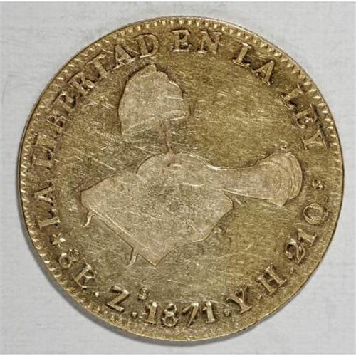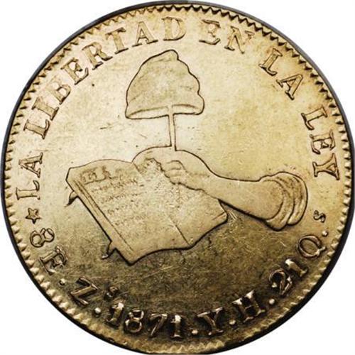 <B>Republic Hand on Book gold 8 Escudos 1871 Zs-YH,</B></I> KM383.11, lustrous XF.<BR><BR><b>Shipping:</b> Coins & Currency (<a target="_blank" href="http://www.heritageauctions.com/common/shipping.php">view shipping information</a>)