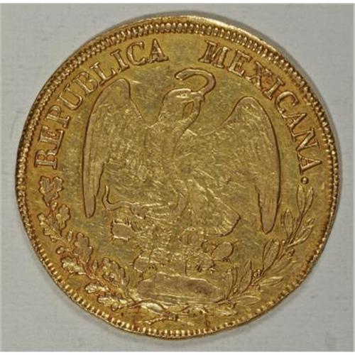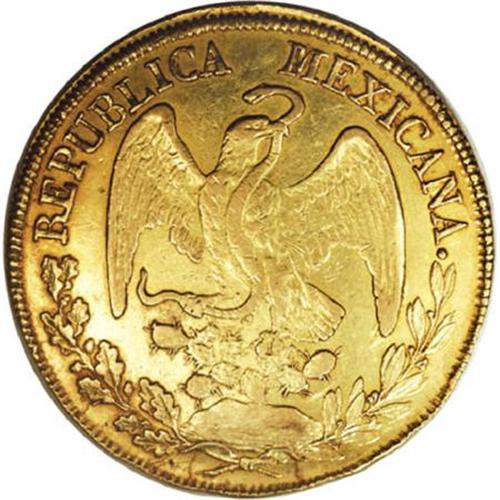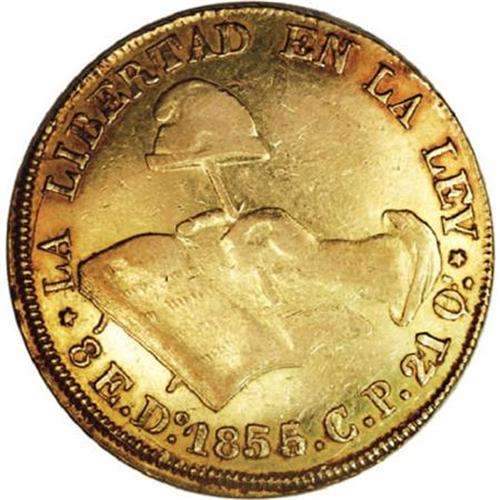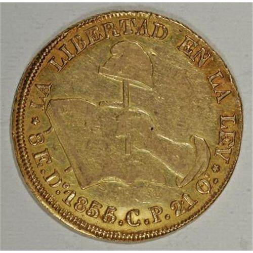<B>Republic Hand on Book gold 8 Escudos 1855/4 Do-CP,</B></I> KM383.3, XF with luster remaining. A very scarce issue with an above average strike. The overdate is bold and easily seen.<BR><BR><b>Shipping:</b> Coins & Currency (<a target="_blank" href="http://www.heritageauctions.com/common/shipping.php">view shipping information</a>)
