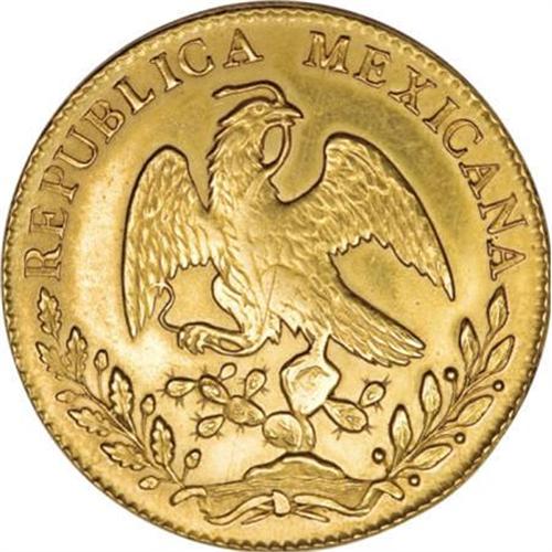 <B>Republic Hand on Book gold 8 Escudos 1865/53 Mo-TH,</B></I> KM383.9, Choice AU with softly struck centers. <BR><BR><b>Shipping:</b> Coins & Currency (<a target="_blank" href="http://www.heritageauctions.com/common/shipping.php">view shipping information</a>)