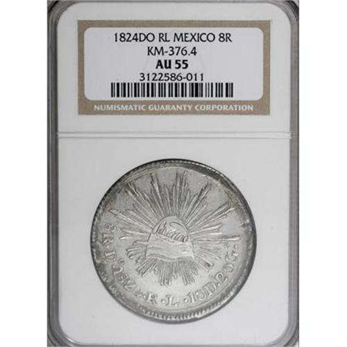 <B>Republic Hookneck 8 Reales 1824 Do-RL,</B></I> KM376.4, AU55 NGC. Fully lustrous with a fantastic strike for the issue and a few light flan flaws. An exceptional example of this scarce type.<BR><BR><b>Shipping:</b> Coins & Currency (<a target="_blank" href="http://www.heritageauctions.com/common/shipping.php">view shipping information</a>)