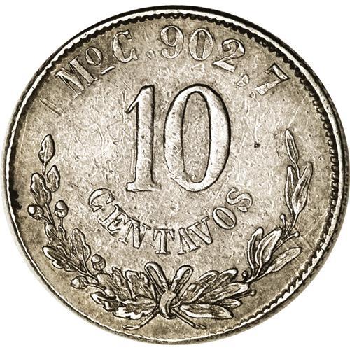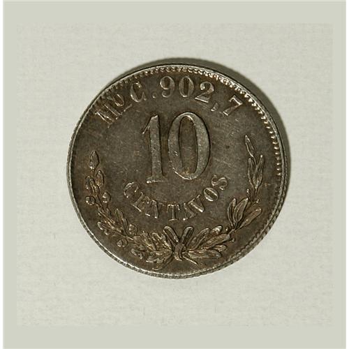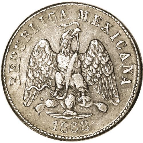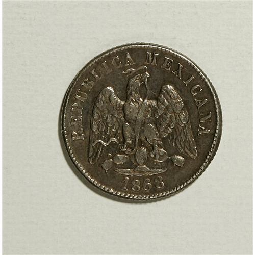 <B>Republic. Pattern silver 10 Centavos 1868-Mo C,</B></I> Reeded Edge, type of KM-403.7 but date unlisted. The first date listed, curiously, is 1869/8. Over 8! Here there is no trace of a 9, only a bold and rounded 8. Probably made during the end of the era of Maximilian, and somehow found its way into circulation. XF and sharp, golden gray toning; surfaces show many tiny marks from being in commercial use. Very rare!<BR><BR><b>Shipping:</b> Coins & Currency (<a target="_blank" href="http://www.heritageauctions.com/common/shipping.php">view shipping information</a>)