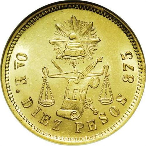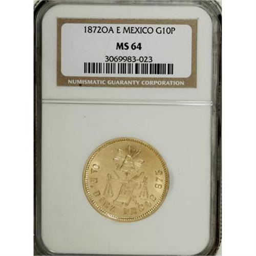 <B>Republic gold 10 Pesos 1872-OaE,</B></I> KM-413.8, MS64 NGC, yellow gold, choice and well struck for Oaxaca.<BR><BR><b>Shipping:</b> Coins & Currency (<a target="_blank" href="http://www.heritageauctions.com/common/shipping.php">view shipping information</a>)