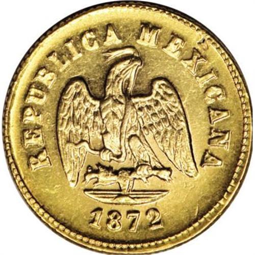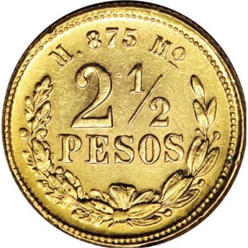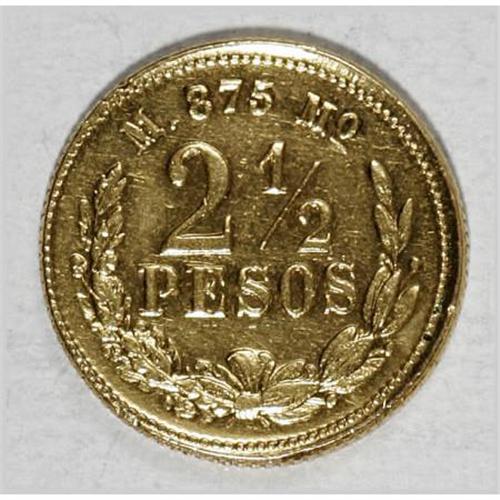 <B>Republic gold 2-1/2 Pesos 1872 Mo-M,</B></I> KM411.5, XF-AU with a small obverse flan flaw. <BR><BR><b>Shipping:</b> Coins & Currency (<a target="_blank" href="http://www.heritageauctions.com/common/shipping.php">view shipping information</a>)