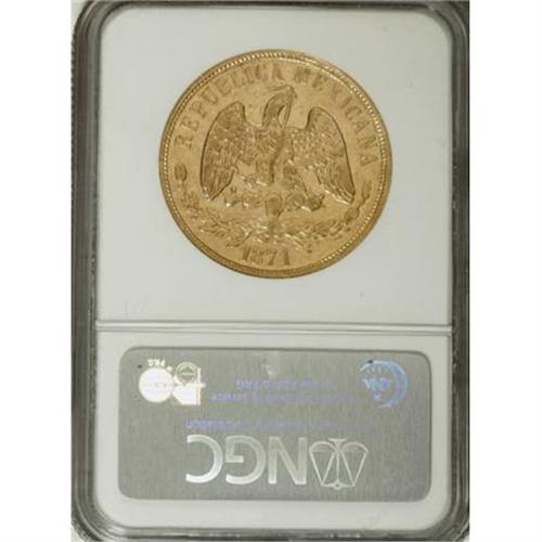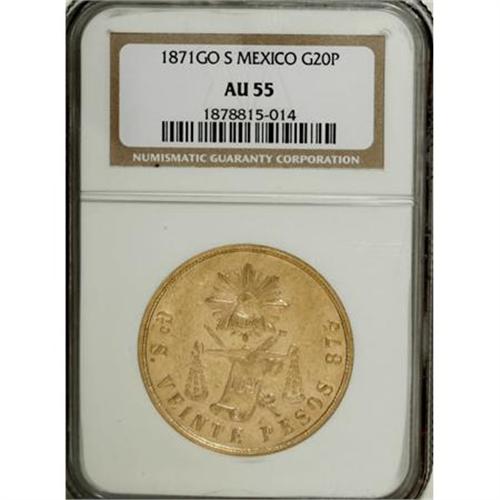 <B>Republic gold 20 Pesos 1871-GoS,</B></I> KM-414.4, AU55 NGC, lots of lustrous sparkle.<BR><BR><b>Shipping:</b> Coins & Currency (<a target="_blank" href="http://www.heritageauctions.com/common/shipping.php">view shipping information</a>)