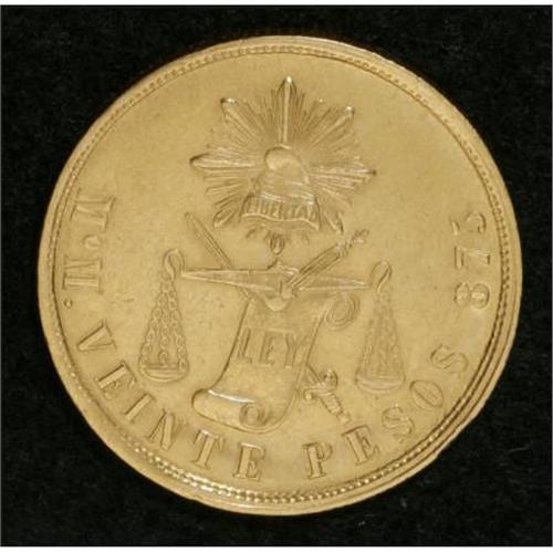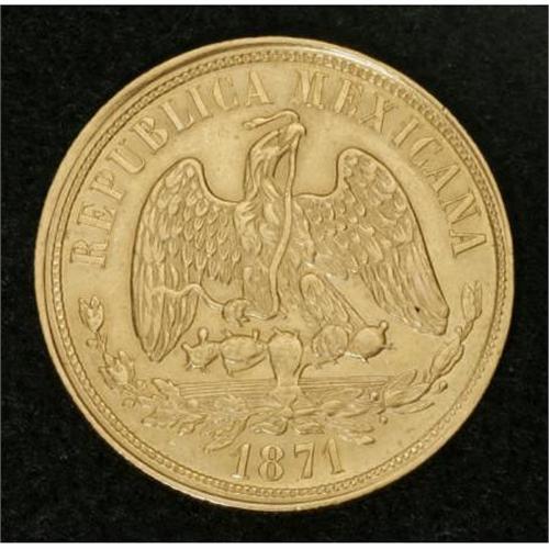 <B>Republic gold 20 Pesos 1871-MoC,</B></I> KM-414.6, Choice AU, old-time gold color, real pleasant for the grade.<BR><BR><b>Shipping:</b> Coins & Currency (<a target="_blank" href="http://www.heritageauctions.com/common/shipping.php">view shipping information</a>)
