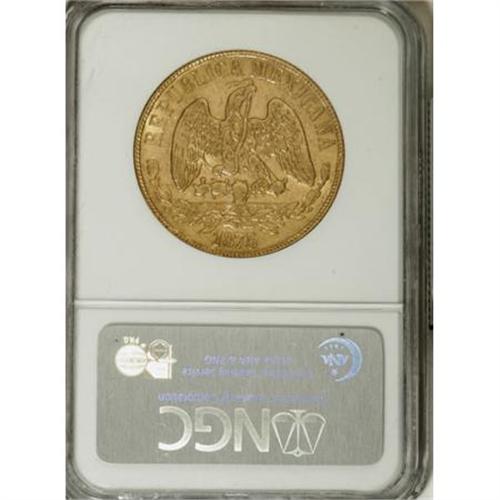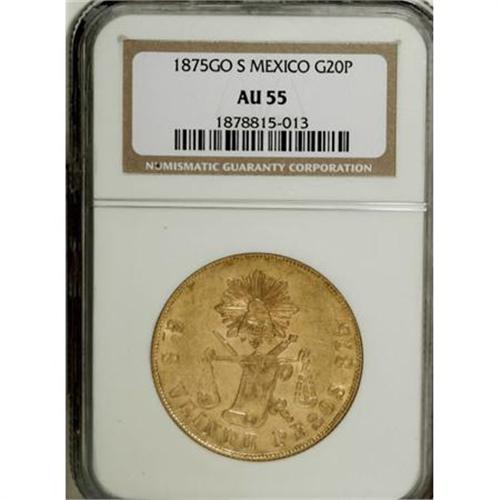<B>Republic gold 20 Pesos 1875-GoS,</B></I> KM-414.4, AU55 NGC, old-gold surfaces.<BR><BR><b>Shipping:</b> Coins & Currency (<a target="_blank" href="http://www.heritageauctions.com/common/shipping.php">view shipping information</a>)