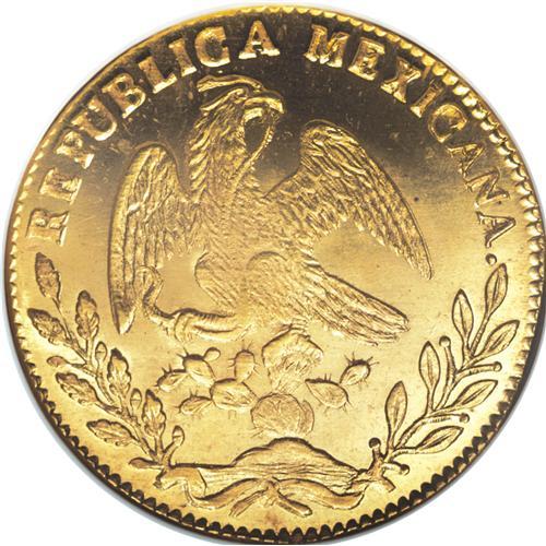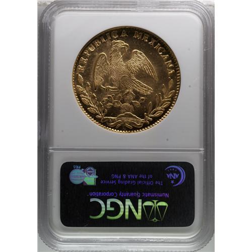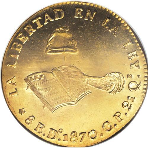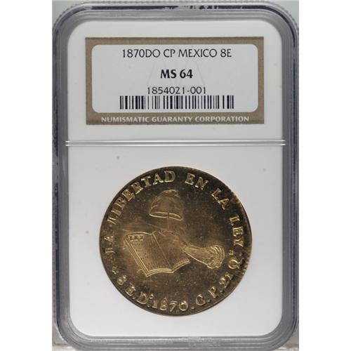 <B>Republic gold 8 Escudos 1870 Do-CP,</B></I> KM383.3, MS64 NGC. The last date of production of the Durango Mint and a popular issue. This piece is undoubtedly one of the finer surviving examples. The strike is as nice as you could expect of the issue with an incredible blazing mint luster and only tiny imperfections (most visible only under magnification). A truly stunning example of 8 Escudo production from one of the more storied mints.<BR><BR><b>Shipping:</b> Coins & Currency (<a target="_blank" href="http://www.heritageauctions.com/common/shipping.php">view shipping information</a>)