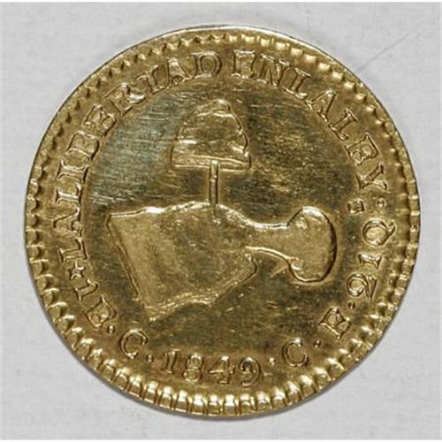 <B>Republic gold Hand on Book 1 Escudo 1849/8 C-CE,</B></I> KM379, VF with a reverse flan flaw. A very scarce issue.<BR><BR><b>Shipping:</b> Coins & Currency (<a target="_blank" href="http://www.heritageauctions.com/common/shipping.php">view shipping information</a>)