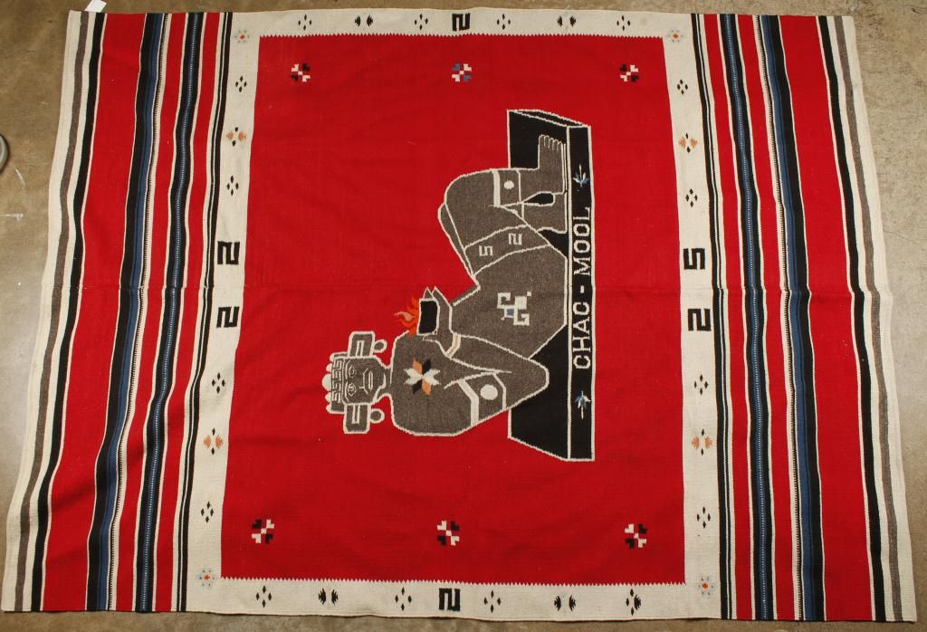 Double looped and striped, "Chac Mool", red center with blue, cream, black, and grey stripes on both sides, 2 piece construction, in overall good condition, no fading but some small staining on edges, measures 75"x56".