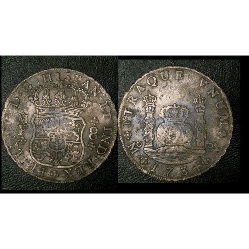 Mexico Silver 8 Reales KM#103 1734Mo VF(b)<BR><BR>Each individual coin and/or lot will show the gradefollowed by a letter ranking (a), (b) and (c). The letter (a) will indicate that the salt water has had some minor affect on the coins and its patina is not unattractive. The letter (b) will indicate that the coinsshow some form of sea immersion affects in that the patina may show slightly more corrosion, however the coin remains aesthetically pleasing. The letter (c) will indicate sea immersion affects more severe than the (b) type described above, but all the dates and details will be there and visible. Extensively damaged or worn coins will be described and priced as such.<BR><BR>Notice. For all winners of lots pertaining to the Auguste Shipwreck, please be advised that due to Canadian Laws in reference to the Exportation of Archeological and Shipwreck finds, a request for permission to export these items must to be filled and sent into Canadian Customs for approval for every lot won and shipped outside Canada. In most cases this will cause a delay of 10 to 20 business days for all shipment of lots once payment received. We have been in discussion with Canada Customs and anticipate no problems. We ask for your patience and will do our best to keep each buyer updated on their lots. Please contact us for further information if necessary.