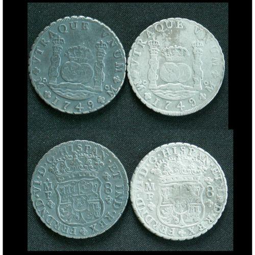 Mexico Silver 8 Reales KM#104,1 1749Mo VF(b). Lot of 2 coins<BR><BR>Each individual coin and/or lot will show the gradefollowed by a letter ranking (a), (b) and (c). The letter (a) will indicate that the salt water has had some minor affect on the coins and its patina is not unattractive. The letter (b) will indicate that the coinsshow some form of sea immersion affects in that the patina may show slightly more corrosion, however the coin remains aesthetically pleasing. The letter (c) will indicate sea immersion affects more severe than the (b) type described above, but all the dates and details will be there and visible. Extensively damaged or worn coins will be described and priced as such.<BR><BR>Notice. For all winners of lots pertaining to the Auguste Shipwreck, please be advised that due to Canadian Laws in reference to the Exportation of Archeological and Shipwreck finds, a request for permission to export these items must to be filled and sent into Canadian Customs for approval for every lot won and shipped outside Canada. In most cases this will cause a delay of 10 to 20 business days for all shipment of lots once payment received. We have been in discussion with Canada Customs and anticipate no problems. We ask for your patience and will do our best to keep each buyer updated on their lots. Please contact us for further information if necessary.