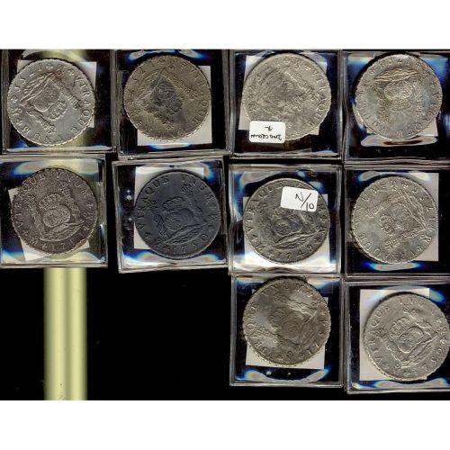 Mexico Silver 8 Reales (Mo). Lot of 10 pcs including 1749, 1750, 1751, 1752, 1754 early crown, 1755, 1756, 1757 early crown, 1757 Later Crown, and 1758. Fine to VF with moderate to heavy sea corrosion.<BR><BR>Each individual coin and/or lot will show the gradefollowed by a letter ranking (a), (b) and (c). The letter (a) will indicate that the salt water has had some minor affect on the coins and its patina is not unattractive. The letter (b) will indicate that the coinsshow some form of sea immersion affects in that the patina may show slightly more corrosion, however the coin remains aesthetically pleasing. The letter (c) will indicate sea immersion affects more severe than the (b) type described above, but all the dates and details will be there and visible. Extensively damaged or worn coins will be described and priced as such.<BR><BR>Notice. For all winners of lots pertaining to the Auguste Shipwreck, please be advised that due to Canadian Laws in reference to the Exportation of Archeological and Shipwreck finds, a request for permission to export these items must to be filled and sent into Canadian Customs for approval for every lot won and shipped outside Canada. In most cases this will cause a delay of 10 to 20 business days for all shipment of lots once payment received. We have been in discussion with Canada Customs and anticipate no problems. We ask for your patience and will do our best to keep each buyer updated on their lots. Please contact us for further information if necessary.