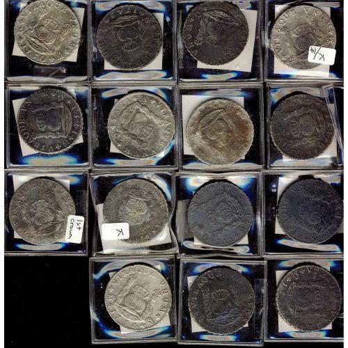 Mexico Silver 8 Reales (Mo). Lot of 15 pcs including 1747, 1748, 1749, 1750, 1751, 1752, 1753, 1754 early crown, 1754 later crown, 1755, 1756, 1757 early crown, 1757 Later Crown, 1758 and 1759. Fine to VF with moderate to heavy sea corrosion.<BR><BR>Each individual coin and/or lot will show the gradefollowed by a letter ranking (a), (b) and (c). The letter (a) will indicate that the salt water has had some minor affect on the coins and its patina is not unattractive. The letter (b) will indicate that the coinsshow some form of sea immersion affects in that the patina may show slightly more corrosion, however the coin remains aesthetically pleasing. The letter (c) will indicate sea immersion affects more severe than the (b) type described above, but all the dates and details will be there and visible. Extensively damaged or worn coins will be described and priced as such.<BR><BR>Notice. For all winners of lots pertaining to the Auguste Shipwreck, please be advised that due to Canadian Laws in reference to the Exportation of Archeological and Shipwreck finds, a request for permission to export these items must to be filled and sent into Canadian Customs for approval for every lot won and shipped outside Canada. In most cases this will cause a delay of 10 to 20 business days for all shipment of lots once payment received. We have been in discussion with Canada Customs and anticipate no problems. We ask for your patience and will do our best to keep each buyer updated on their lots. Please contact us for further information if necessary.