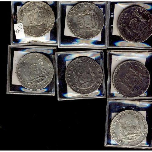 Mexico Silver 8 Reales (Mo). Lot of 7 coins including 1752(6) and 1754(1). VG to VF with moderate to heavy sea corrosion.<BR><BR>Each individual coin and/or lot will show the gradefollowed by a letter ranking (a), (b) and (c). The letter (a) will indicate that the salt water has had some minor affect on the coins and its patina is not unattractive. The letter (b) will indicate that the coinsshow some form of sea immersion affects in that the patina may show slightly more corrosion, however the coin remains aesthetically pleasing. The letter (c) will indicate sea immersion affects more severe than the (b) type described above, but all the dates and details will be there and visible. Extensively damaged or worn coins will be described and priced as such.<BR><BR>Notice. For all winners of lots pertaining to the Auguste Shipwreck, please be advised that due to Canadian Laws in reference to the Exportation of Archeological and Shipwreck finds, a request for permission to export these items must to be filled and sent into Canadian Customs for approval for every lot won and shipped outside Canada. In most cases this will cause a delay of 10 to 20 business days for all shipment of lots once payment received. We have been in discussion with Canada Customs and anticipate no problems. We ask for your patience and will do our best to keep each buyer updated on their lots. Please contact us for further information if necessary.