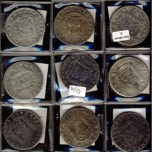 Mexico Silver 8 Reales (Mo). Lot of 9 pcs including 1749, 1750, 1752, 1754 early crown, 1755, 1756, 1757 early crown, 1757 Later Crown, and 1758. Fine to VF with moderate to heavy sea corrosion.<BR><BR>Each individual coin and/or lot will show the gradefollowed by a letter ranking (a), (b) and (c). The letter (a) will indicate that the salt water has had some minor affect on the coins and its patina is not unattractive. The letter (b) will indicate that the coinsshow some form of sea immersion affects in that the patina may show slightly more corrosion, however the coin remains aesthetically pleasing. The letter (c) will indicate sea immersion affects more severe than the (b) type described above, but all the dates and details will be there and visible. Extensively damaged or worn coins will be described and priced as such.<BR><BR>Notice. For all winners of lots pertaining to the Auguste Shipwreck, please be advised that due to Canadian Laws in reference to the Exportation of Archeological and Shipwreck finds, a request for permission to export these items must to be filled and sent into Canadian Customs for approval for every lot won and shipped outside Canada. In most cases this will cause a delay of 10 to 20 business days for all shipment of lots once payment received. We have been in discussion with Canada Customs and anticipate no problems. We ask for your patience and will do our best to keep each buyer updated on their lots. Please contact us for further information if necessary.