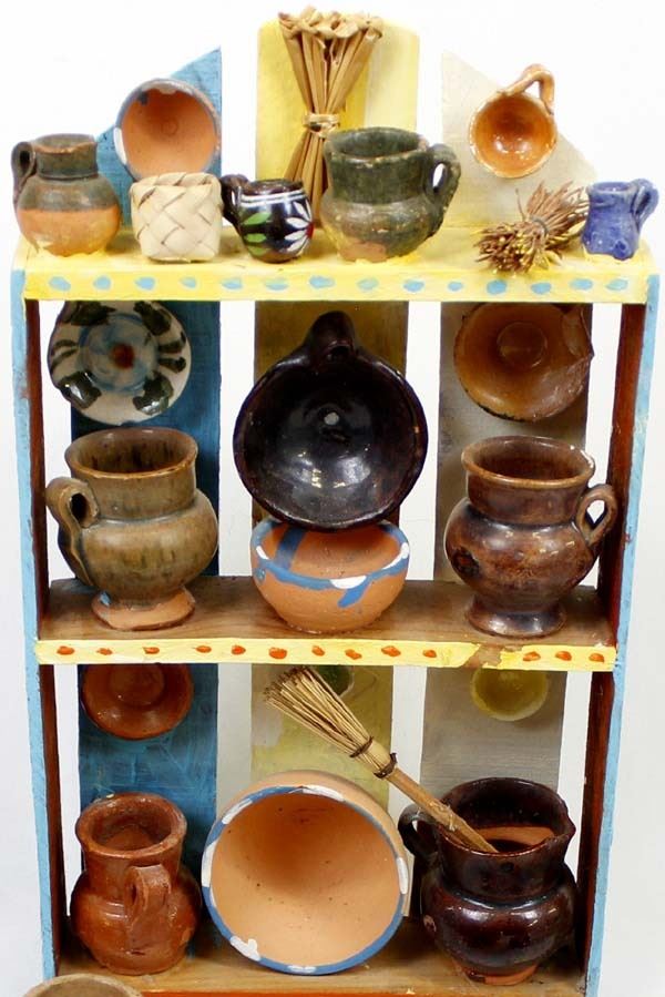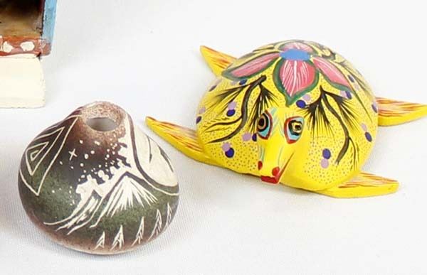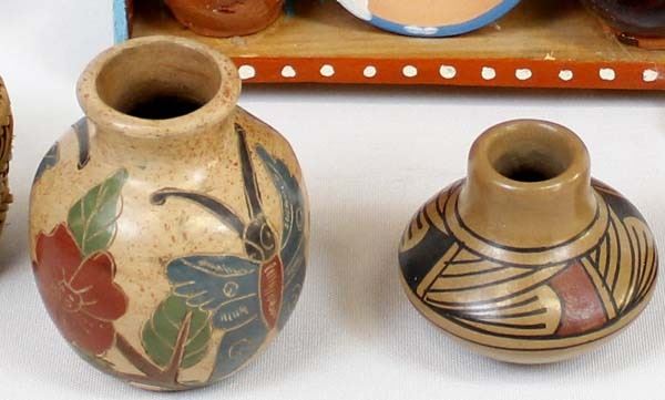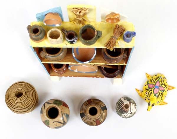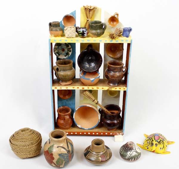 Mexican, South America, & Native American Collectibles, includes 1. Hand Painted Wood Shelf with Mexican Pottery Display, largest measuring 12''H x 6.5''W x 2.5''Deep 2. Tarahumara Graduated Baskets 3. Oaxacan Turtle by Francisco Hernandez 4. Navajo Incised Pottery Seed Jar by Harrison Tom 5. Mata Ortiz Pottery Vase 6. Nicaraguan Incised Pottery Jar