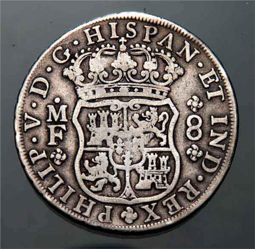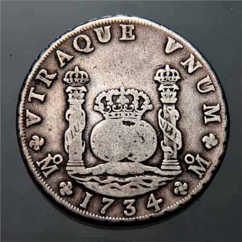 Oltremare - Messico - Dominazione spagnola - Filippo V (1700-1746) - 8 Reali 1734 - Metallo: Ag - Zecca: Città del Messico - Diritto: stemma coronato - Rovescio: i due emisferi affiancati e sovrastati da una corona fra le colonne d'Ercole coronate - gr. 26,17