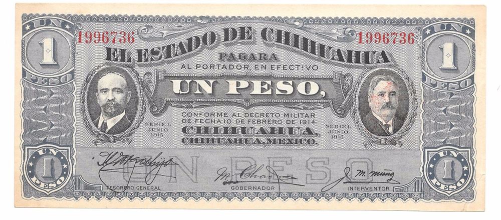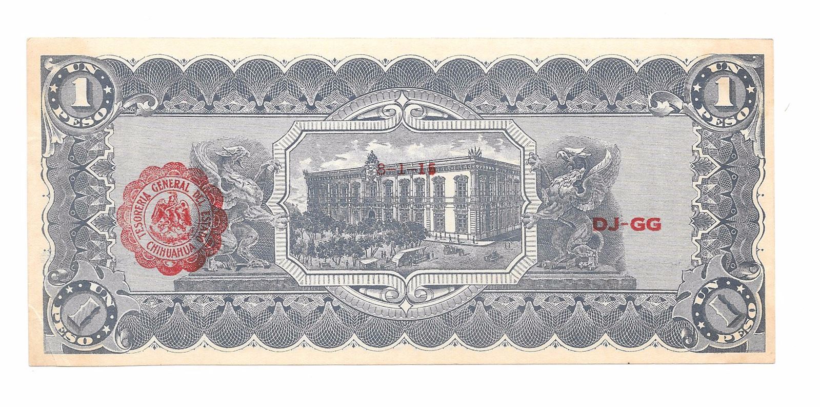 Mexico state of Chihuahua 1 peso paper money, June 1913.