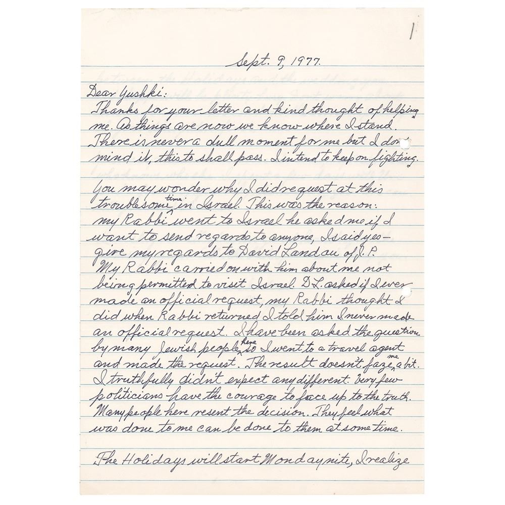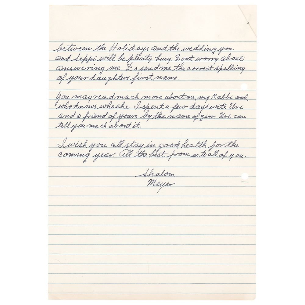 Legendary organized crime leader (1902–1983) who headed the notorious ‘enforcement’ syndicate Murder, Inc., which emerged in the early 1930s as successor to the warring Prohibition gangs and the old-line Mafia, and continued to operate into the 1950s. ALS signed “Meyer,” two pages, 7.5 x 10.5, September 9, 1977. Handwritten letter to his Israeli confidante, Joseph "Yushki" Sheiner, a member of the Israeli Security Agency and Prime Minister Ben-Gurion’s security director in the 1960s. In part: "You may wonder why I did request at this troublesome time in Israel. This was the reason: My Rabbi went to Israel he asked me if I want to send regards to [Israeli Journalist] David Landau of I. P. My Rabbi carried on with him about not being permitted to visit Israel. D. L. asked if I ever made an official request…I never made an official request. I have been asked the question by many Jewish people here so I went to a travel agent and made the request. The result doesn’t faze me a bit. I truthfully didn’t expect any different. Very few politicians have the courage to face up to the truth. Many people here resent the decision. They feel what was done to me can be done to them at some time.” In fine condition, with two file holes to the right edge.