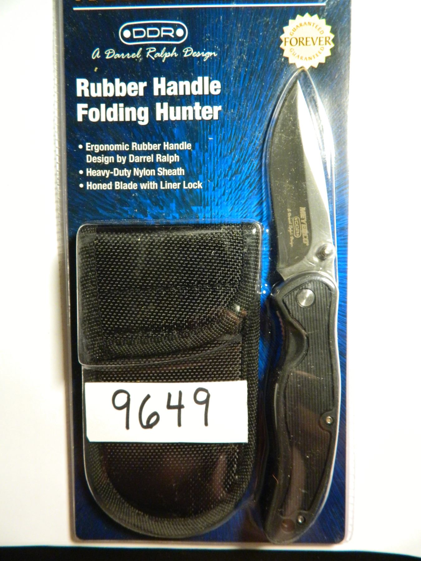 Folding Hunter - 4 1/2" closed linerlock. 3 1/4" stainless blade. Black rubberized handles with grooved insert. Lanyard hole. Black nylon belt sheath. Designed by Darrel Ralph