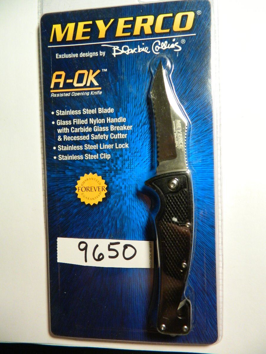 Linerlock A/O A-OK Rescue 4" closed. 3" stainless assisted opening scalloped edge modified tanto blade with grip ridges. Checkered black glass filled nylon handles with integrated seat belt cutter and glass breaker. Stainless pocket clip. Designed by Blackie Collins