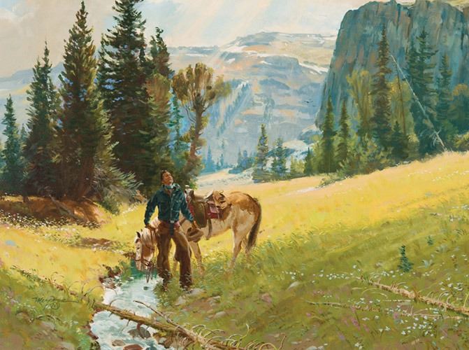 Leaving the hustle of the commercial art world in New York for the life of a Wyoming rancher, Bob Meyers nonetheless kept his brush moving between chores. Meyers’s easy Western realism was beginning to attract attention when his life was cut short by a bullet in what seems to have been an old fashioned feud over a property line.