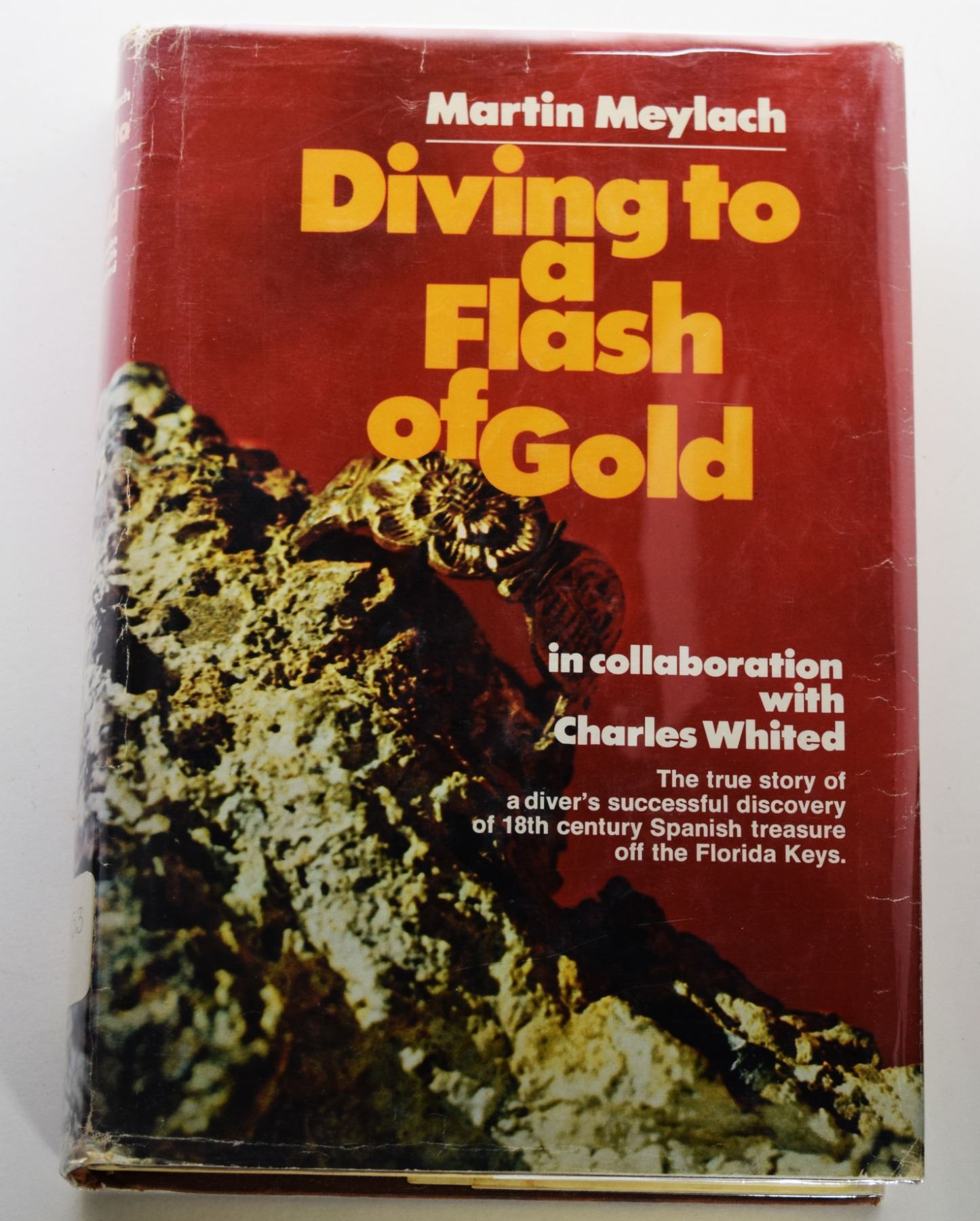 Meylach, Martin. DIVING TO A FLASH OF GOLD. Doubleday & Company, Inc. 1971. 8vo, 373 pages; Hardcover w/ DJ; ex Library; The true story of a diver's successful discovery of 18th century Spanish treasures off the Florida Keys. Locations of over 130 wrecks. Includes 1986 Federal Court Opinion Regarding Salvage Rights at the Coffins Patch Reef 10-page pamphlet. Subject: History - Sunken Treasure