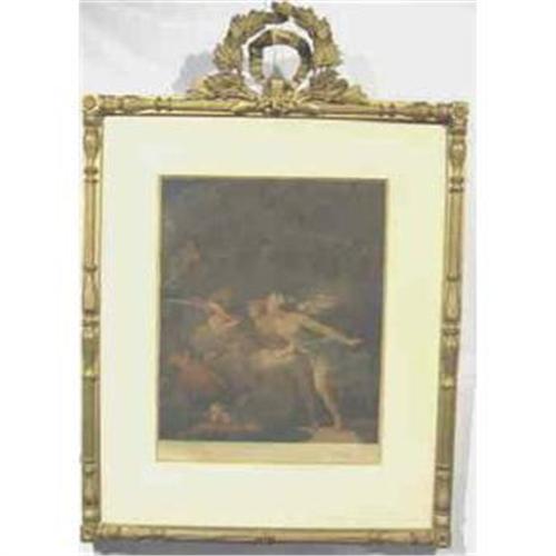 Many more pictures available! This is a mezzotint mounted in a wood, wire and gesso frame that has some damage. The mezzotint in the frame is signed underneath in pencil as follows,"ENGRAVED & PRINTED IN COLOUR IN ONE PRINTING BY FRED MILLAR"