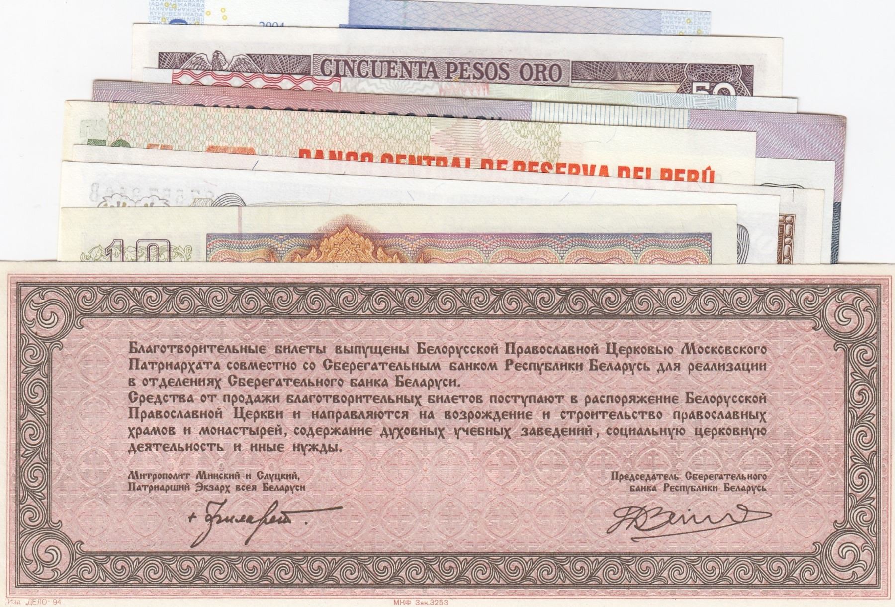 Mi Lot, 10 different banknotes. AUNC/ UNCbr/Belarus, 10000 Rubles,1994; Zambia, 2 Kwacha, 2015; Burma, 10 Kyat, 1973; Philippines, 10 Pezos, 1949;
