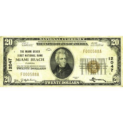 <B>Miami Beach, FL</B></I> - $20 1929 Ty. 1 <B>The Miami Beach First NB</B></I> Ch. # 12047<BR>Hardly a rare bank, but there are never enough notes from here to satisfy the collecting fraternity. <B>Fine.</B></I>