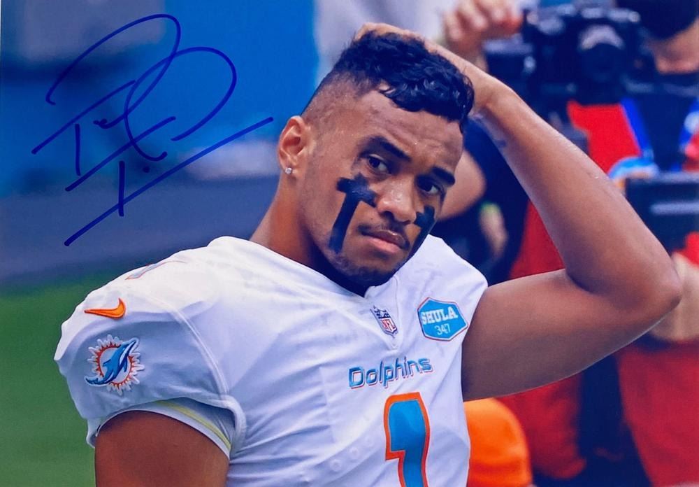 Miami Dolphins Tua Tagovailoa facsimile signed photo. 8x10 inches. This item is a reprint of an original autograph