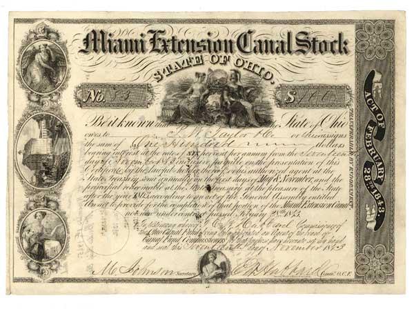 1843. Ohio. $100 bond bearing 6% interest. Black/White. Multi vignetted of allegorical figures at top center, and lady top and bottom right and scene middle right. Cut cancelled. Fine.