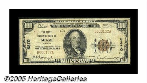 <B>Miami, FL</B></I> - $100 1929 Ty. 1 <B>The First NB</B></I> Ch. # 6370<BR>A new high denomination example for the census from this always in-demand community. <B>About Fine.</B></I>
