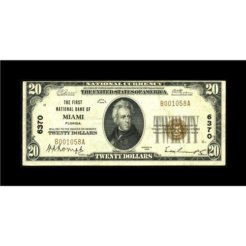 <B>Miami, FL</B></I> - $20 1929 Ty. 1 <B>The First NB</B></I> Ch. # 6370<BR>The Romph family managed the largest national bank in Miami during this period. <B>Very Fine.</B></I><BR><BR><b>Shipping:</b> Coin/Currency (<a target="_blank" href="http://www.heritageauctions.com/common/shipping.php">view shipping information</a>)