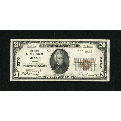 <B>Miami, FL</B></I> - $20 1929 Ty. 1 <B>The First NB</B></I> Ch. # 6370<BR> The Romph family managed the largest national bank in Miami during this period. Pleasing <B>Very Fine</B></I> with some crispness remaining.<BR><BR><b>Shipping:</b> Coins & Currency (<a target="_blank" href="http://www.heritageauctions.com/common/shipping.php">view shipping information</a>)
