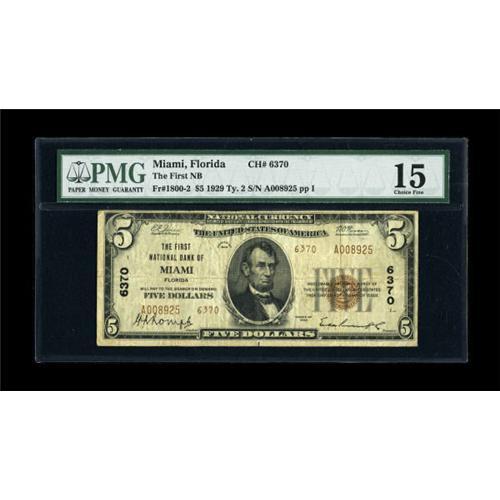 <B>Miami, FL</B></I> - $5 1929 Ty. 2 <B>The First NB</B></I> Ch. # 6370<BR> While small notes from this bank are certainly not difficult to find, with over 120 examples reported to date, Type 2 specimens from here are another matter entirely, with the census showing a mere three such notes recorded. The Sunshine State Collection example is an evenly circulated and problem free piece which has been graded <B>Choice Fine 15</B></I> by PMG.<BR><I>From The Sunshine State Collection.</B></I><BR><BR><b>Shipping:</b> Coins & Currency (<a target="_blank" href="http://www.heritageauctions.com/common/shipping.php">view shipping information</a>)