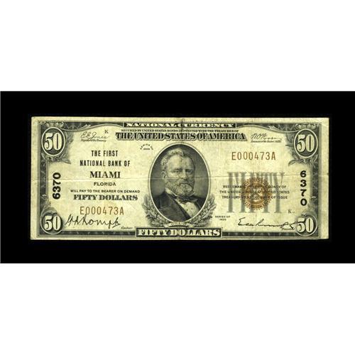 <B>Miami, FL</B></I> - $50 1929 Ty. 1 <B>The First NB</B></I> Ch. # 6370<BR>A <B>Fine-Very Fine</B></I> $50 from one of only two banks in the state to issue this type and denomination.<BR><BR><b>Shipping:</b> Coin/Currency (<a target="_blank" href="http://www.heritageauctions.com/common/shipping.php">view shipping information</a>)