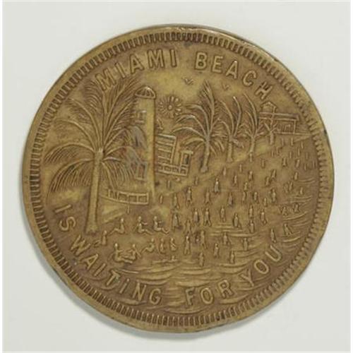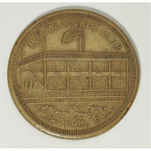 <B>Miami Jockey Club Token.</B></I> Token/medal issued by the Miami Jockey Club, which opened in 1925 but did not have racing until the early 1930s. This piece would have been from that era. It features the grandstand on one side and Miami Beach on the other.<BR><BR><b>Shipping:</b> Coins & Currency (<a target="_blank" href="http://www.heritageauctions.com/common/shipping.php">view shipping information</a>)