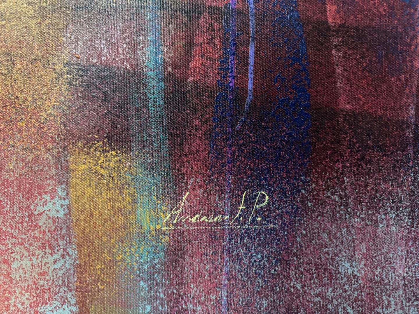 Exquisite original acrylic on 59x59" canvas, hand signed by Palacios. This artwork comes rolledin a tube.