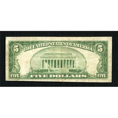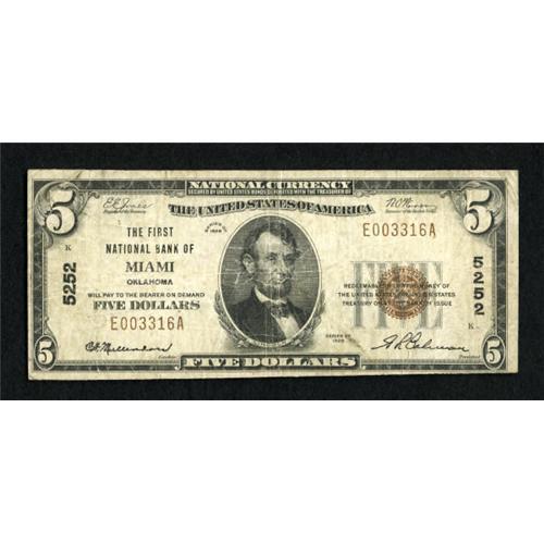 <B>Miami, OK</B></I> - $5 1929 Ty. 1 <B>The First NB </B></I> Ch. # 5252 This is a tougher bank than the numbers imply. Cashier C.H. Mullendore served more than one president of this bank. This example has paper snap, but it was wet at one time. A few spots are on the back. <B>Fine.</B></I><BR><BR><b>Shipping:</b> Coins & Currency (<a target="_blank" href="http://www.heritageauctions.com/common/shipping.php">view shipping information</a>)