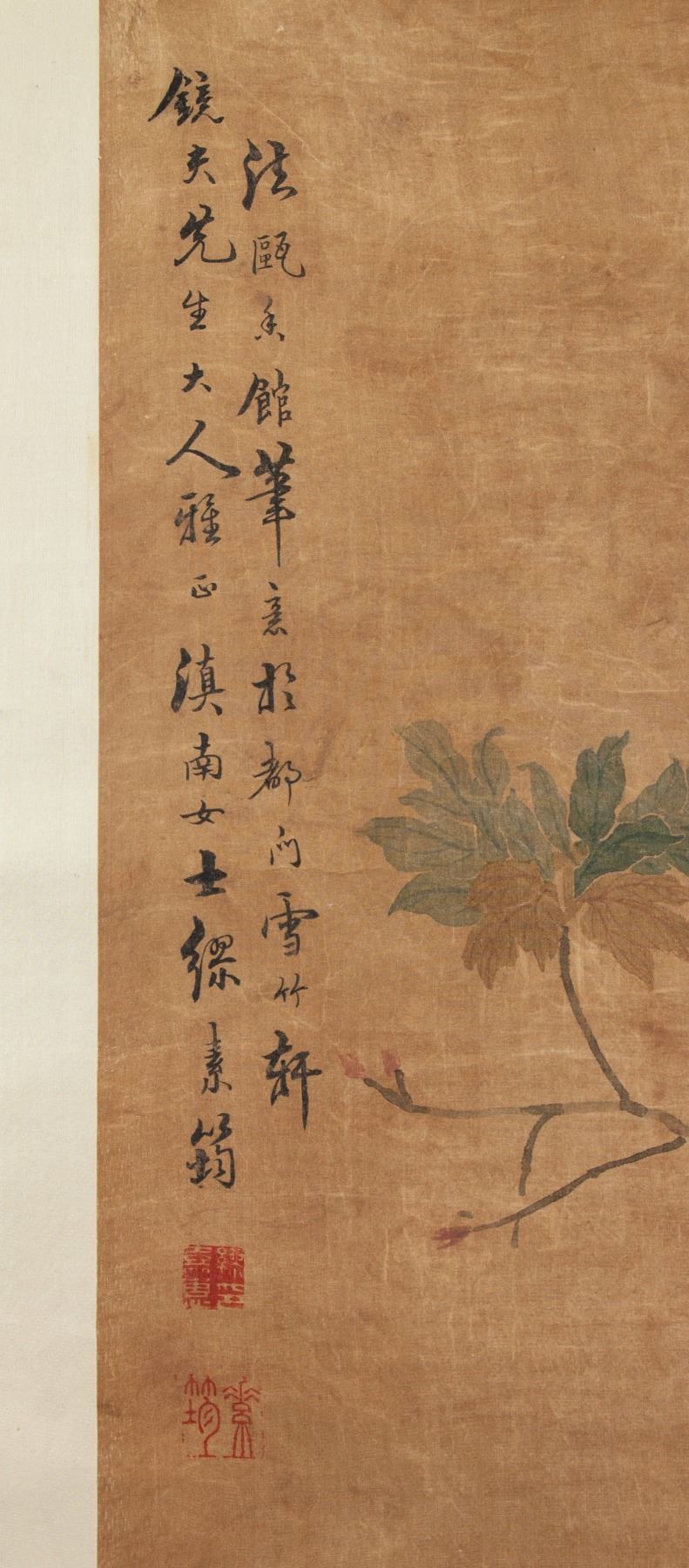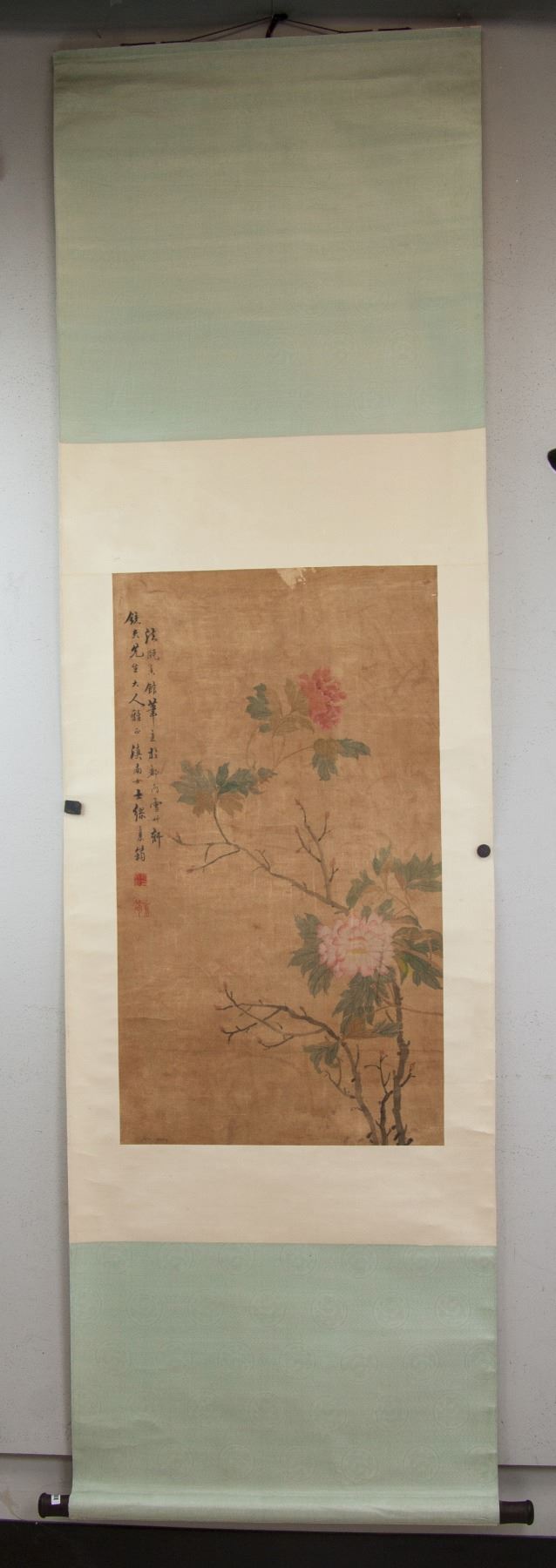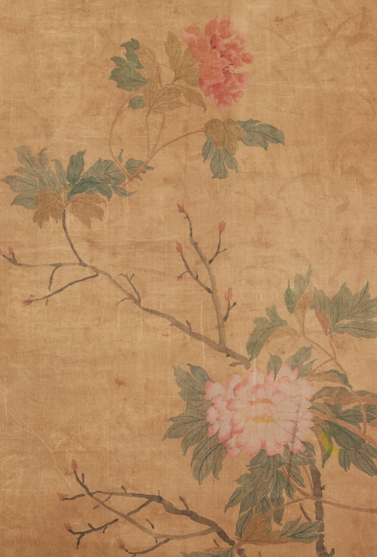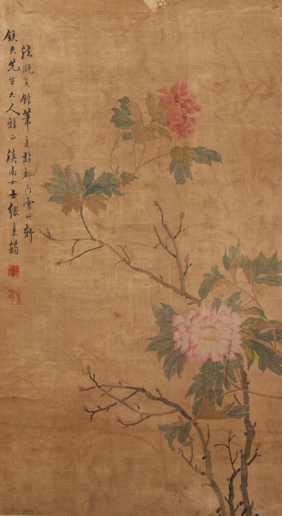 Painting of peony; Chinese ink and watercolour on silk; hanging scroll; signed Miao Jiahui (1831-1908); inscribed with 2 artist seals; 83.5 cm x 47.5 cm