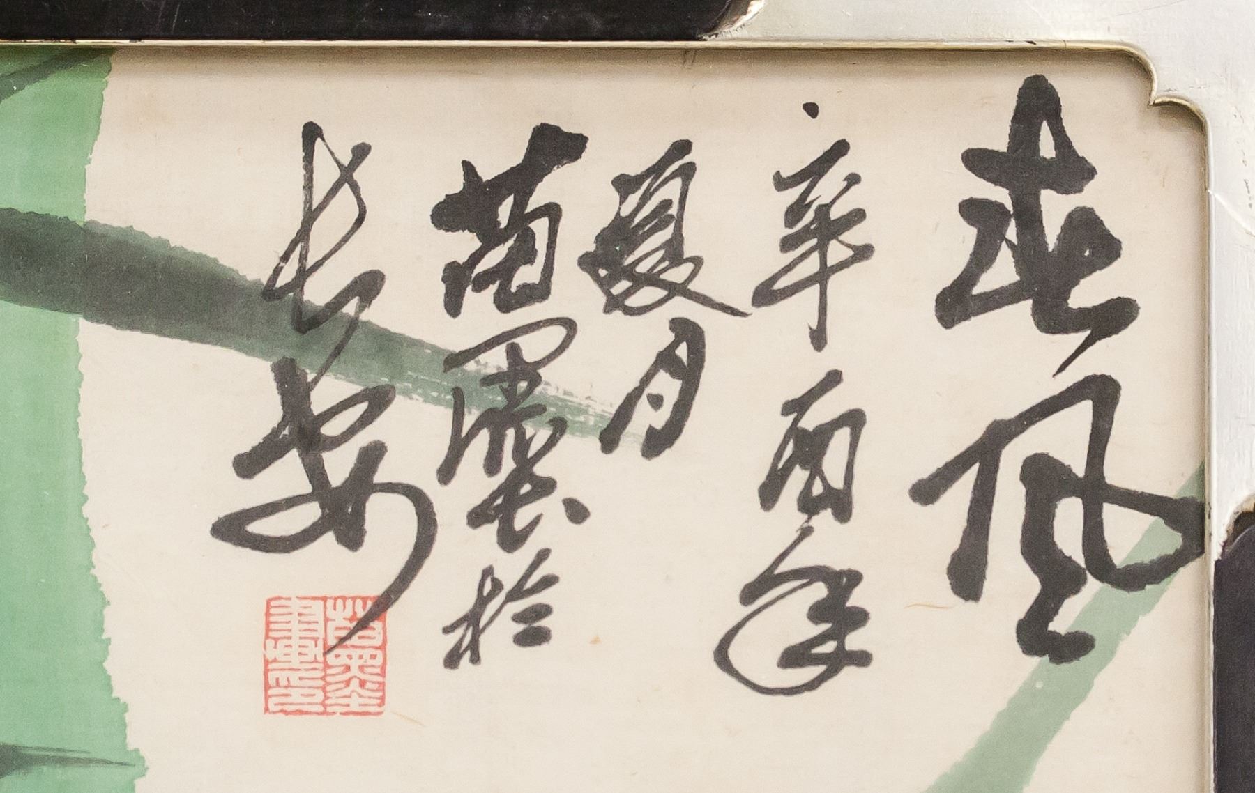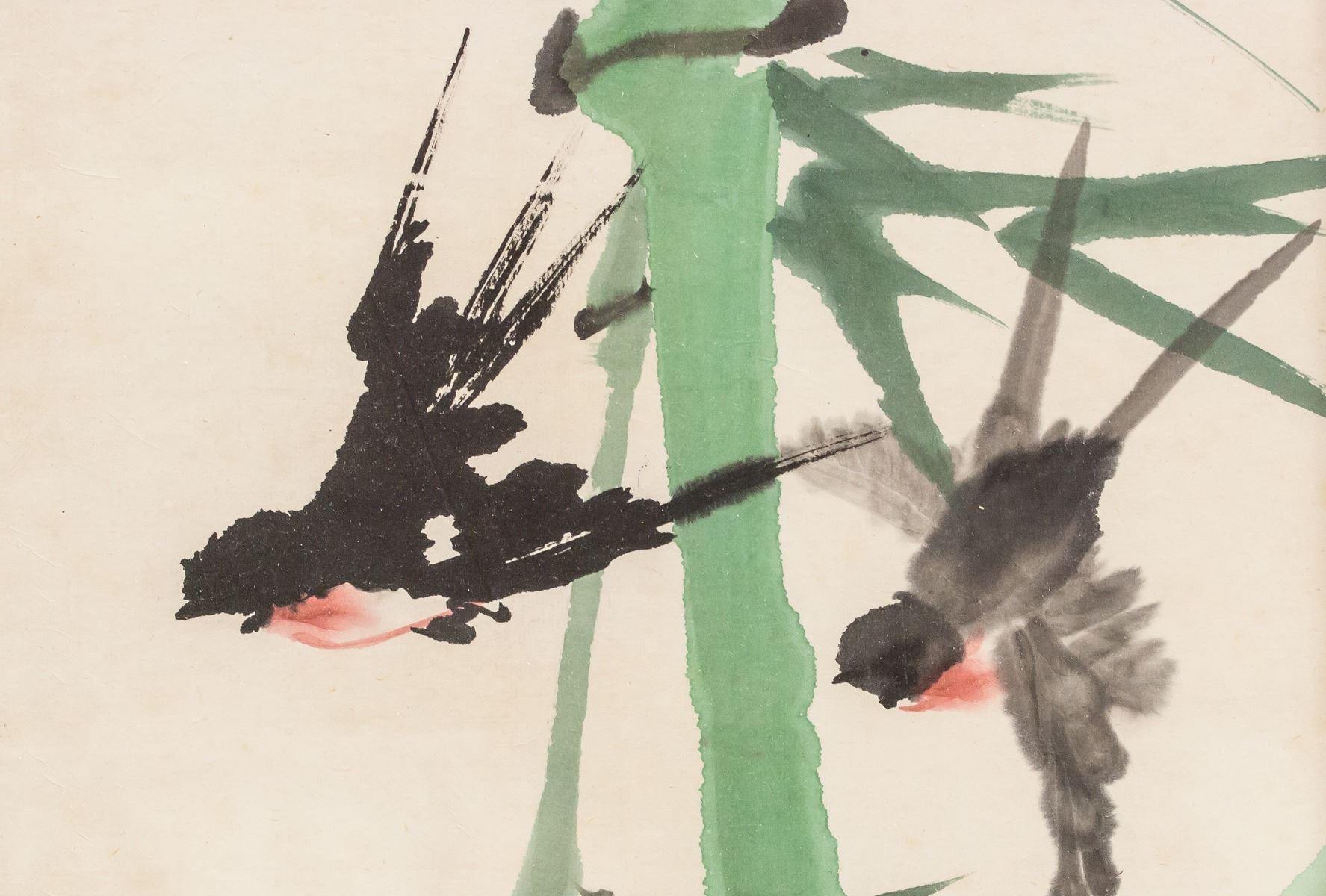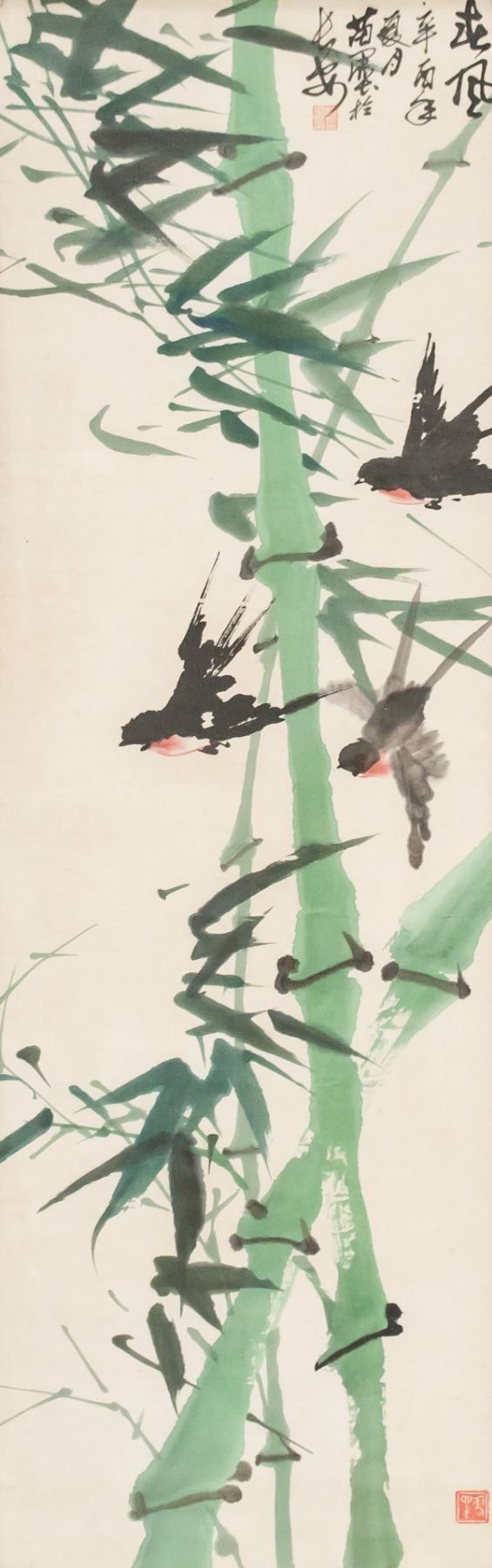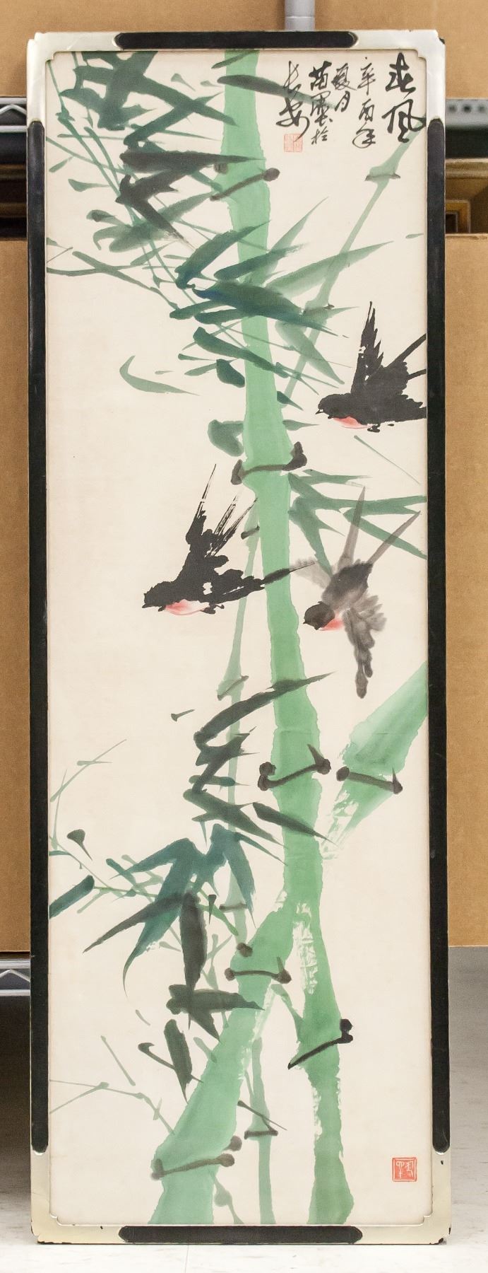 Ink and watercolor on paper, framed. Featuring bamboo and swallows. Signed Miao Mo (b.1940, Chinese), inscribed with 1 artist seal. Framed size: 101 x 35 cm (39.5 x 14 in)