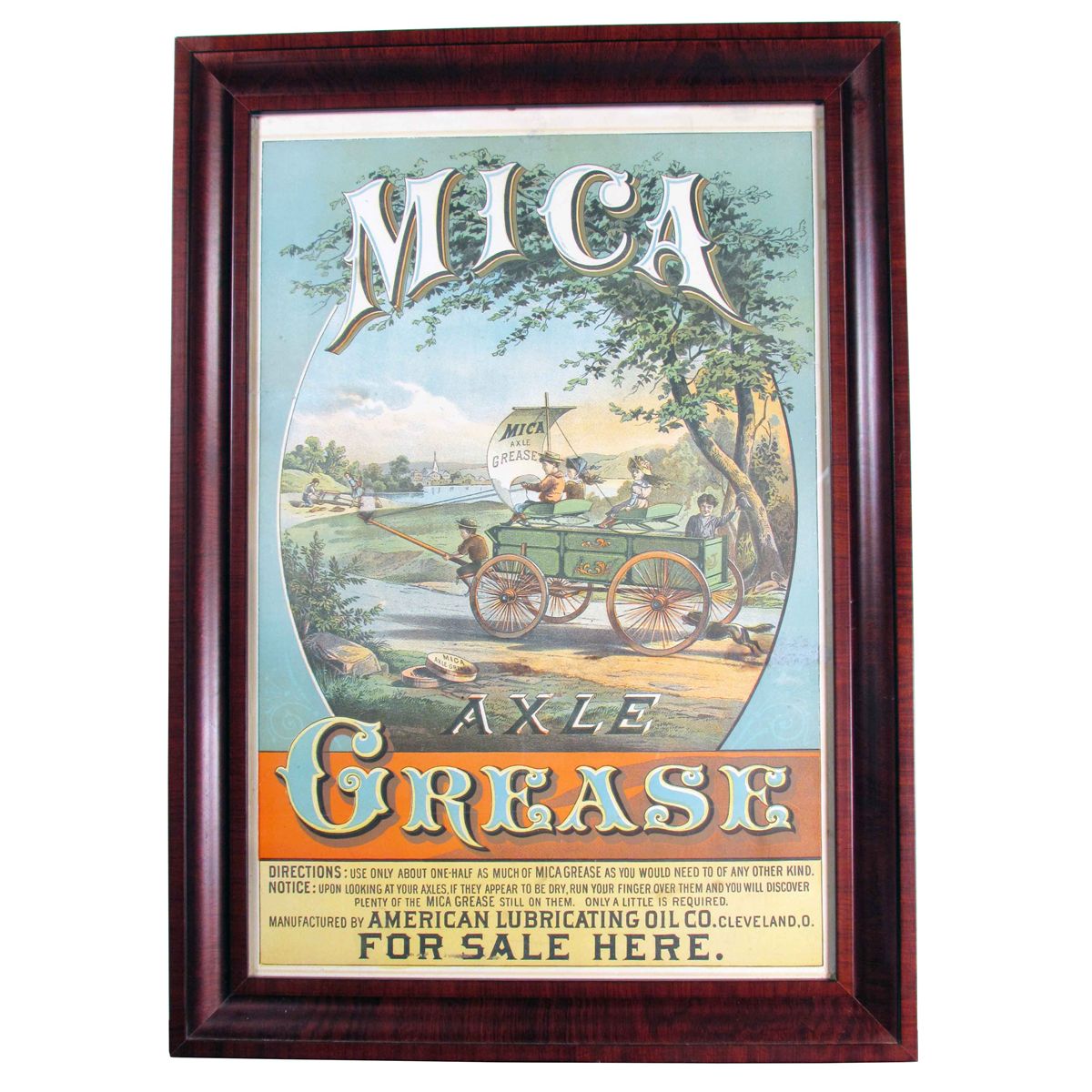 Mica Axle Grease Paper Sign. American Lubricating Oil Co. Cleveland, O. Framed under glass. Great graphics. Some very minor staining and fold crease at center otherwise excellent condition. 14 X 21 inches image only.