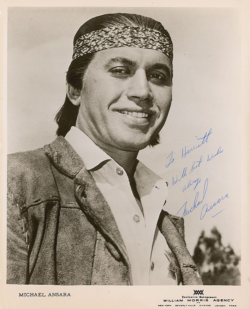 Glossy 8 x 10 publicity photo of Ansara as Sam Buckhart in Law of the Plainsman, signed and inscribed in blue ballpoint, “To Harriett, With best wishes always, Michael Ansara.” Binder dings to left and right edges, otherwise fine condition.