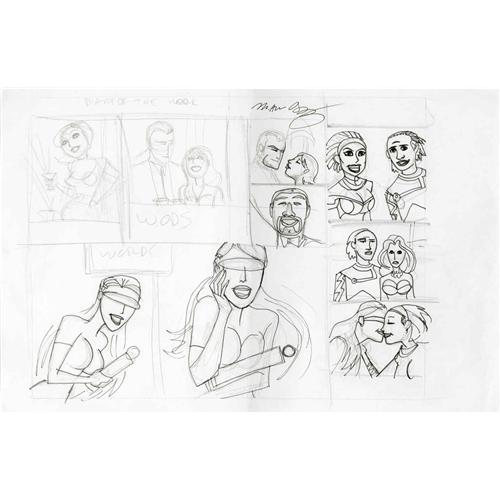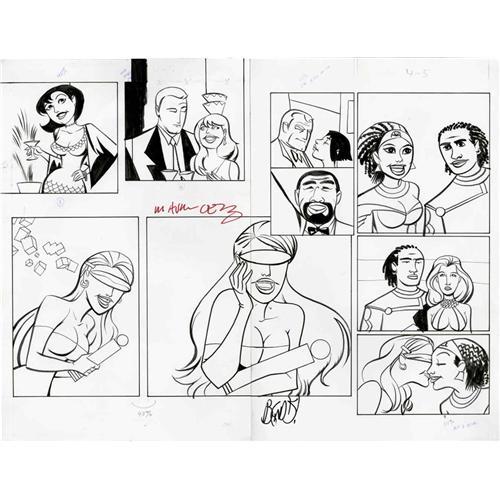 <B>Michael Avon Oeming - Powers, page 4 and 5 Original Art (DC, circa 2004).</B></I> Here is a special insight into how Michael Avon Oeming creates his finished pages for the fan-favorite <B>Powers</B></I> series. This two-page spread from an unidentified issue of <B>Powers</B></I> began as a series of loose pencil and ink panel studies on a 17" x 11" piece of layout paper. The panels were then transferred and finished in ink on a double-page spread (which is taped together on the back). The overall size of these combined pages measures 22" x 17". Finally, notes in the margin indicate different reproduction sizes for each panel, as well as cropping notes. The double-page spread was signed by Michael Avon Oeming and writer Brian Bendis. Both pieces are in Excellent condition.