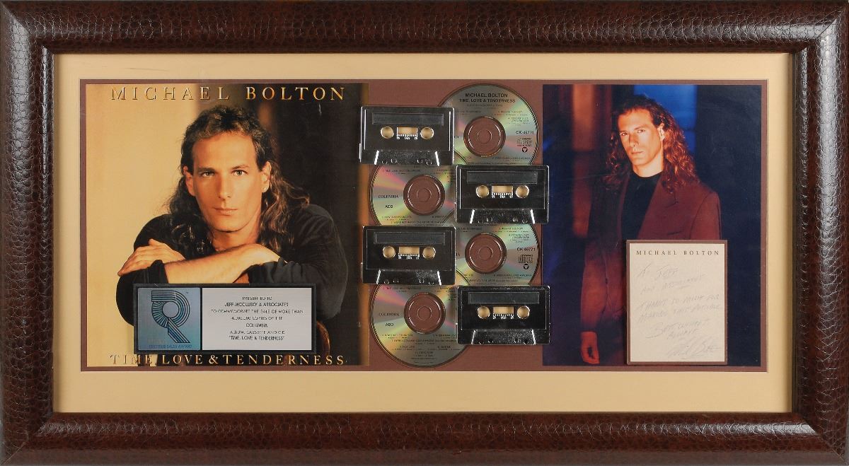Official ‘R’ hologram-style RIAA multi-platinum sales award presented “to commemorate the sale of more than 4,000,000 copies of the Columbia album, cassette and C.D. ‘Time, Love & Tenderness.” Framed with its plate, four CDs and cassettes denoting platinum sales, two large images, and an ANS on personal stationery, “To Jeff and associates, Thanks so much for making this possible. Best wishes, always, Michael Bolton,” to an overall size of 36 x 19.75. Award retains its original backing. In fine condition.