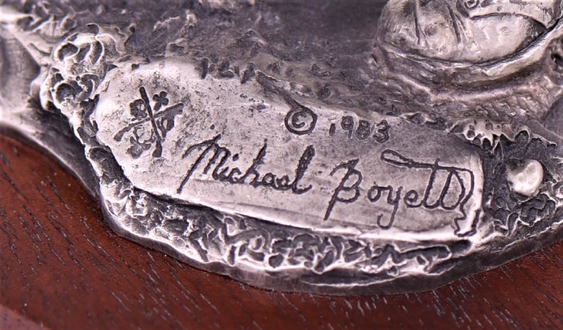 Michael Boyett, 1983 Titled "Bringing In A Buddy" 61 of 1000. Chilmark's Fine Pewter On Wood Base Vietnam Art Sculpture. Estimated less than 50 yrs old. Pewter is a malleable metal alloy, traditionally 85 to 99 percent tin, with the remainder consisting of copper, antimony, bismuth and sometimes, less commonly today, lead. Silver is also sometimes used. Copper and antimony act as hardeners while lead is common in the lower grades of pewter, which have a bluish tint. It has a low melting point, around 338 to 446 deg F, depending on the exact mixture of metals. (Wikepedia) Size and/or Weight: See Measurement Photo. (Photos Represent The Lot Condition.)