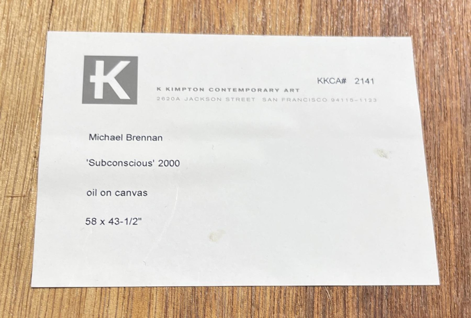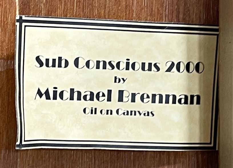 Title is Sub Conscious 2000. Exhibited at the K Kimpton Contemporary Art Gallery San Francisco. 49.5" by 64" framed. 1953 Born, Mill Valley, California 1973 A.A., College of Marin, CA 1974–1975 University of California, Davis, CA 1976 B.F.A., University of California, Santa Cruz Exhibitions 2006 Out of the Shadows: Reflections on a Walk through a Future Park, Susan Street Fine Art Gallery, Solana Beach, CA (solo) 2005 The Day After Tomorrow, K Kimpton Contemporary Art, San Francisco, CA (solo) 2004 Word Play, 455 Market Lobby Gallery, San Francisco, CA (solo) 2004 A Rare Glimpse: Modern American Art from Private Napa Valley Collections, Napa Valley, CA (solo) 2004 Museum, Yountville, CA (solo) 2004 Paintings by Michael Brennan, Leanne Hull Fine Art, La Jolla, CA (solo) 2004 Domaine Chandon, Yountville, CA (solo) 2004 Heart & Soul, Hearts in San Francisco, CA 2003 New Paintings, K Kimpton Contemporary Art, San Francisco, CA (solo) 1999 Countdown: The Millennium Show, K Kimpton Contemporary Art SF, CA 1998 Time, Space & History, Bank of America World Headquarters, San Francisco, CA (solo) 1998 San Francisco International Art Exposition, Fort Mason, SF, CA (solo) 1998 Michael Brennan: New Work, K Kimpton Contemporary Art, San Francisco, CA (solo) 1993 K Kimpton Contemporary Art, San Francisco, CA (solo) 1992 Bank of America World Headquarters, San Francisco, CA (solo) 1991 Peter Miller Gallery, Chicago, IL (solo) 1989 Ivory/Kimpton Gallery, San Francisco, CA (solo) 1989 Elizabeth Leach Gallery, Portland, OR 1988 Shaklee Building, San Francisco, CA (solo) 1987 Ivory/Kimpton Gallery, San Francisco, CA (solo) 1987 Fingerhut Gallery, Edina, MN 1983 Bank of America World Headquarters, San Francisco, CA (solo) 1982 Tenth Anniversary Exhibition, Joseph Chowning Gallery, San Francisco, CA 1981 Joseph Chowning Gallery, San Francisco, CA (solo) 1977 Exhibition for Semi-finalists, Airport Competition, San Francisco, CA 1976 Alumni Exhibition, College of Marin, Marin, CA 1976 Razor Gallery, New York, NY 1976 Stevenson College, University of California, Santa Cruz, CA (solo) 1974 Marin Society of Artists, Marin, CA 1973 Art Student Exhibition, College of Marin, Marin, CA